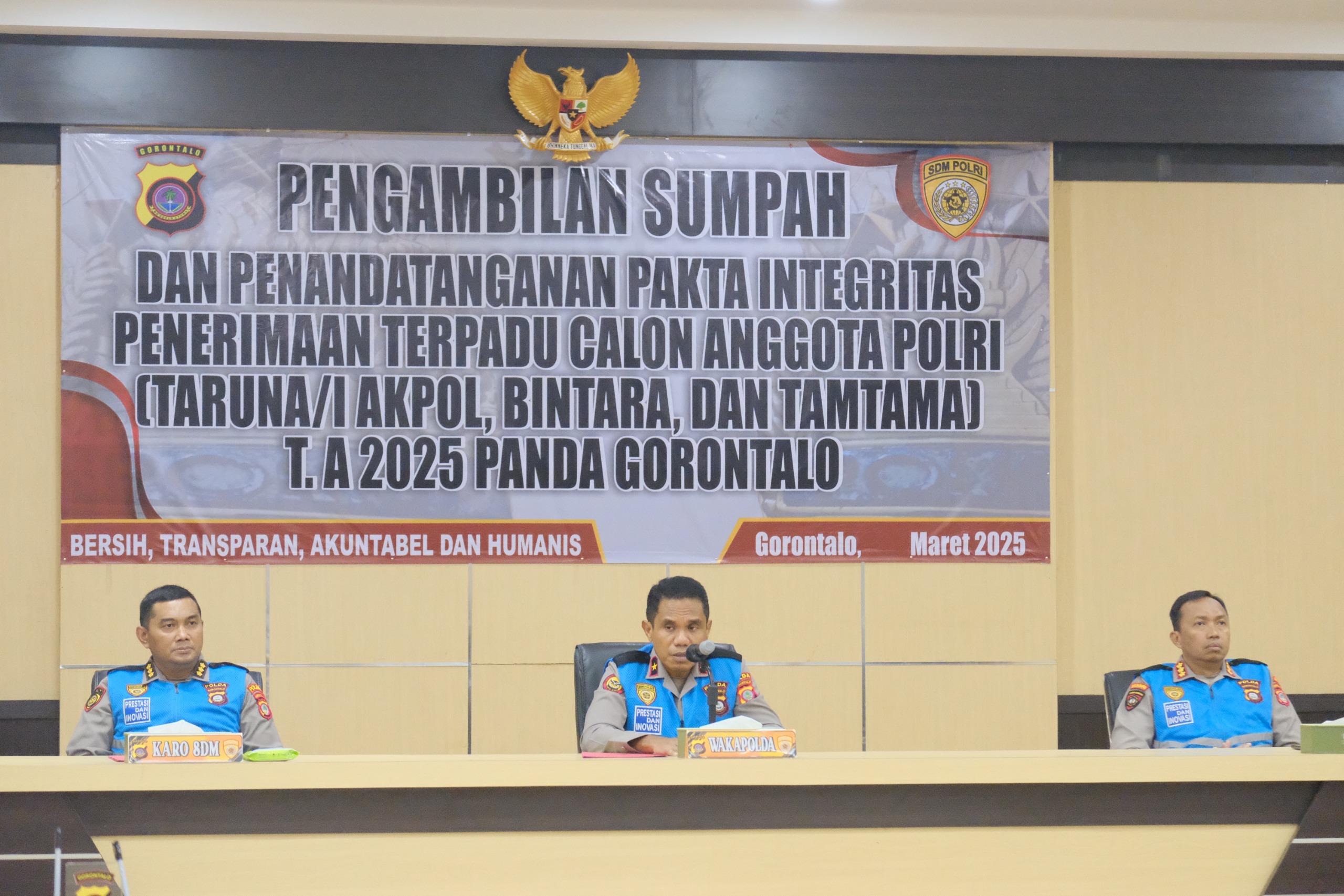 GORONTALO (GOL) – Dalam rangka memastikan proses penerimaan terpadu calon anggota Polri Tahun Anggaran 2025 berjalan secara transparan, akuntabel, dan bebas dari praktik kecurangan, Wakapolda Gorontalo Brigjen Pol. Simson Zet Ringu, S.I.K., M.Si., memimpin langsung kegiatan pengambilan sumpah dan penandatanganan pakta integritas. Acara tersebut berlangsung di Aula Ditlantas Polda Gorontalo, dihadiri oleh Karo SDM Polda Gorontalo Kombes Pol. Dony Wahyudi, S.I.K., serta para Pejabat Utama (PJU) Polda Gorontalo. Jumat(07/03/2025)